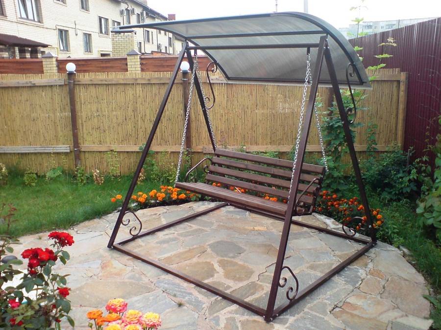 Каркас навеса изготавливается из трубы квадратного сечения 20х20 мм. В качестве кровельного материала для металлических качелей применяют цветной полибикарбонат. Это придает качелям интересный внешний вид.