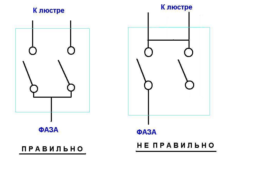 Это наиболее распространенная ошибка, заключающаяся в том, что входящий фазный провод подключают к одному из выходных контактов выключателя. При такой схеме подключения люстра не может нормально функционировать, так как одна секция ламп включается только при условии, что на другую секцию подано напряжение. То есть, если входящая фаза подключена к левому контакту выключателя, при нажатии левой клавиши фаза заходит в распределительную коробку через нижний входной контакт и включает одну секцию ламп. При последующем нажатии правой клавиши включается и другая секция. Но при размыкании левой клавиши отключаются все секции.