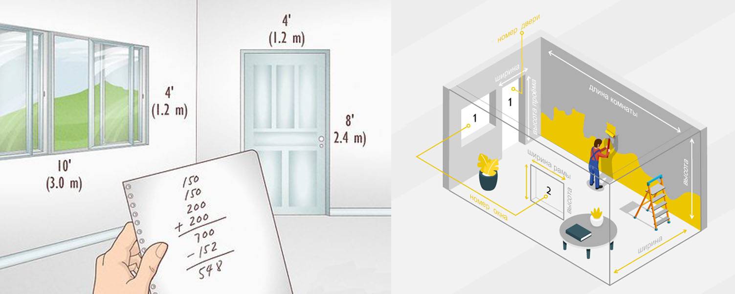 - Площадь стен, дверей и других окрашиваемых поверхностей считается отдельно, а потом суммируется. В таком случае можно избежать ошибок. После получения итогового значения нужно рассчитать необходимый объем краски с учетом рекомендации производителя и советов в статье. Если для разных элементов будут использоваться индивидуальные типы красок, нужно сначала рассчитать площадь, а уже потом рассчитать объем краски.
