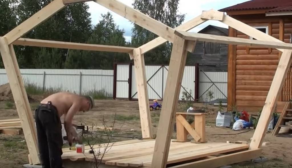 Поскольку сама форма беседок напоминает трапецию, то самое важное наметить боковые части. Вам понадобится выложить доски боковых стен и частей крыши в определенной последовательности, скрепить их, после чего закрепить получившиеся части беседки на нижних досках и сделать временную стяжку