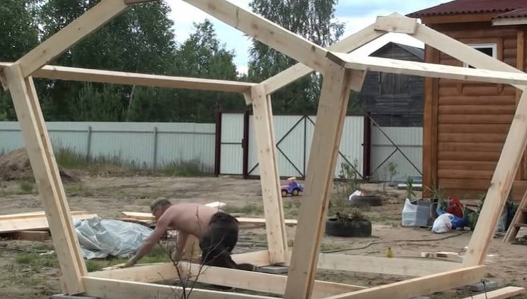 Своими руками можно соорудить садовую беседку в форме шестигранника. Смотрится она необычно и очень интересно, а делать ее просто. Весь процесс работы представлен поэтапно в пошаговой инструкции.