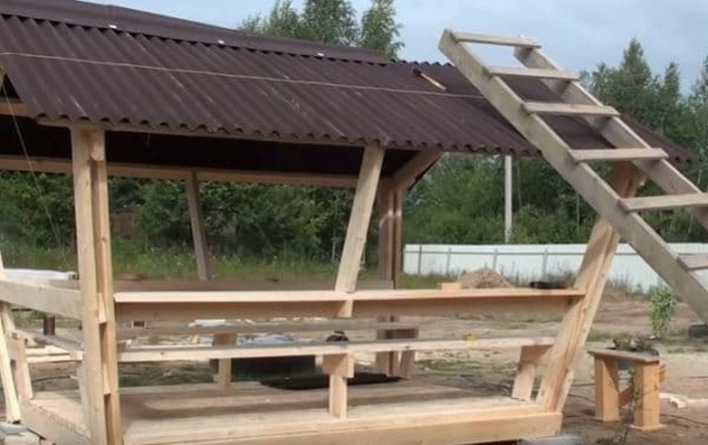 Дальше нужно соорудить основания скамеек по периметру и настелить на них доски. Сделать стяжку стен горизонтальными досками, так, чтобы они выступали и в роли спинок для скамеек. Закрепить крышу досками с дальнейшим покрытием ее металлическими гофрированными листами.