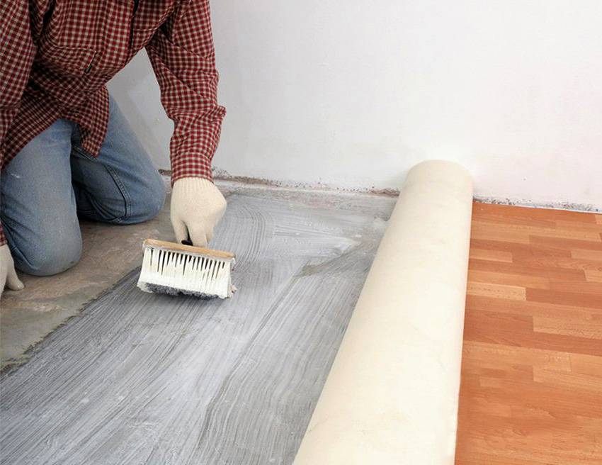 Как и в случае с деревянным основанием, линолеум к бетонному полу крепится несколькими способами: