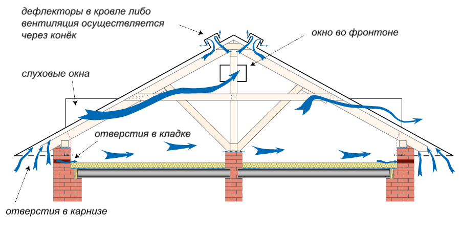Для поддержания этого движения выполняются два естественных выхода: для потока, идущего между черепицей и гидроизоляцией стык между мембранами открывается под коньком крыши, а для тепла, поднимающегося от перекрытия предусмотрены слуховые окна. Наши предки опытным путем выяснили, что нельзя герметично закупоривать пространство, которое не отапливается. Излишки влаги должные свободно испаряться из всех домовых конструкций.