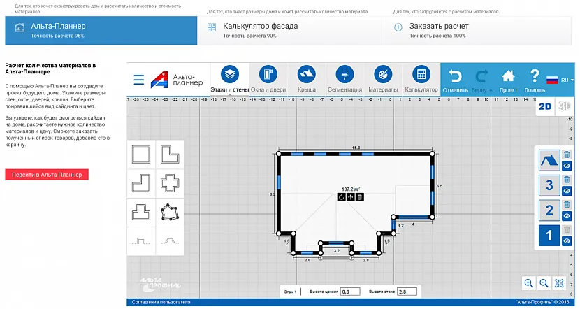 Помимо калькулятора есть и более современные способы расчета и визуализации дома – такие, как планер. С помощью него вы сможет увидеть 3D модель вашего дома и сделать более тонкие расчеты – выставить высоту цоколя, размер окна и т.п.