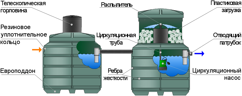 - секция предварительной очистки. На данном этапе происходит разделение загрязнителей на фракции, более тяжёлые нечистоты и фекалии опускаются на дно. Этот отсек требует регулярной очистки;