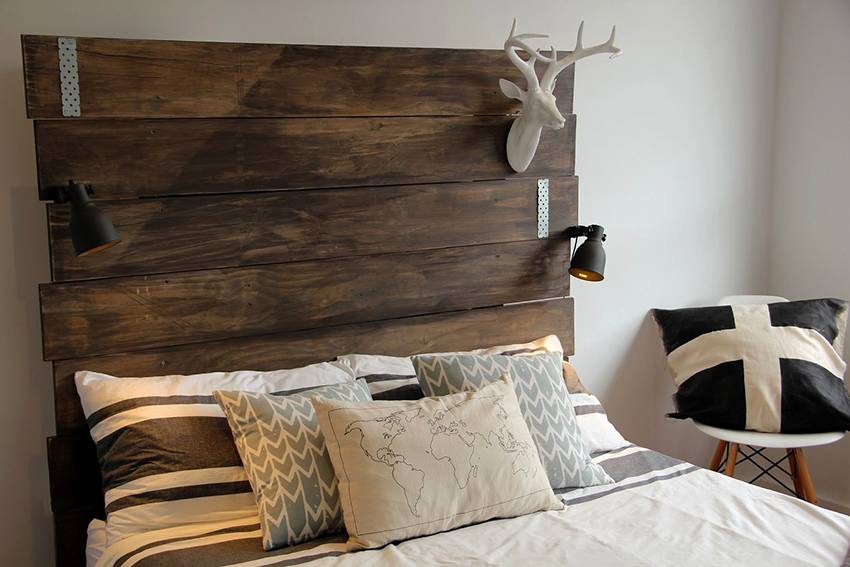 Изголовье изготавливается из того же материала, что и каркас кровати, а сверху его можно обшить мягким материалом, покрасить или установить декоративные инструменты. На нем также можно сделать полки или ящики.