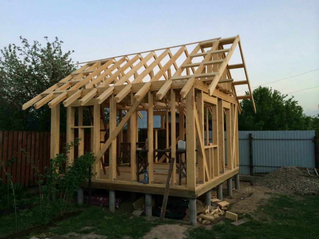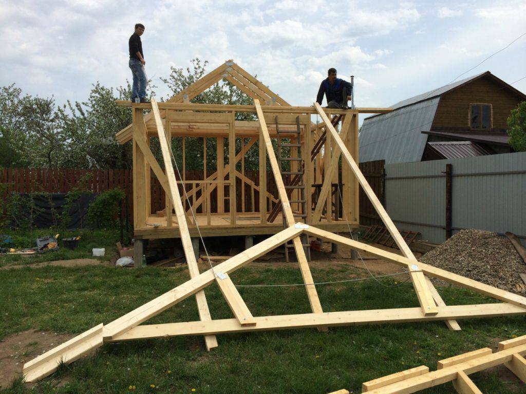 Обратите внимание! Стропила должны немного выступать спереди и сзади здания. Это необходимо, чтобы дождевая вода не скапливалась под фундаментом каркасной бани