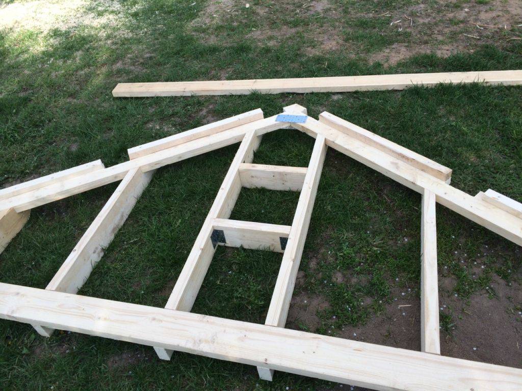 Прибив на конек две доски, я закрепил положение стропил. Устроив раскосы для жесткости (чтобы конструкция не сложилась), я убрал временную коньковую опору.