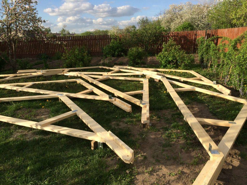 - Монтируем стропила из дерева на опору при помощи деревянных или металлических накладок. Стропила могут иметь форму досок, бревен или брусьев. Расстояние между ними должно быть меньше одного метра.