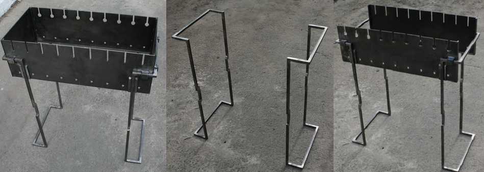 Следующие разборные мангалы сделаны по типу тех, что продаются в магазинах. В них ножки сделаны из уголков, в ножках сделаны пропилы в виде язычков. Эти язычки чуть отогнуты. В боковинах под эти выступы сделаны отверстия. При сборке боковушки «насаживаются» на язычки.