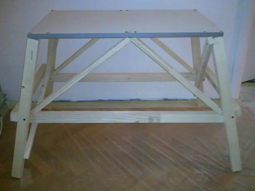 - Возьмите еще четыре деревянных полотна с размерами 1100х100х30 и прикрепите их с торцов. Получается конструкция чем-то напоминающая стол.