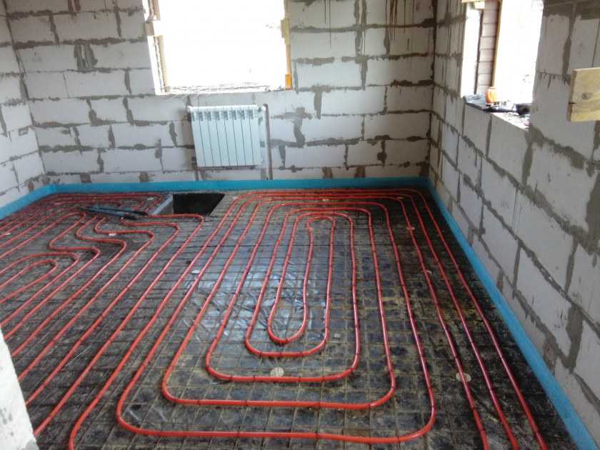 Бетонная стяжка на водяное отопление под полом в частном доме должна выполняться под давлением в системе (прочитайте: “Как выполняется стяжка для водяного теплого пола”). Это проводится перед заливкой с целью проверки всех элементов системы и предотвращения возникновения трещин в начале эксплуатации