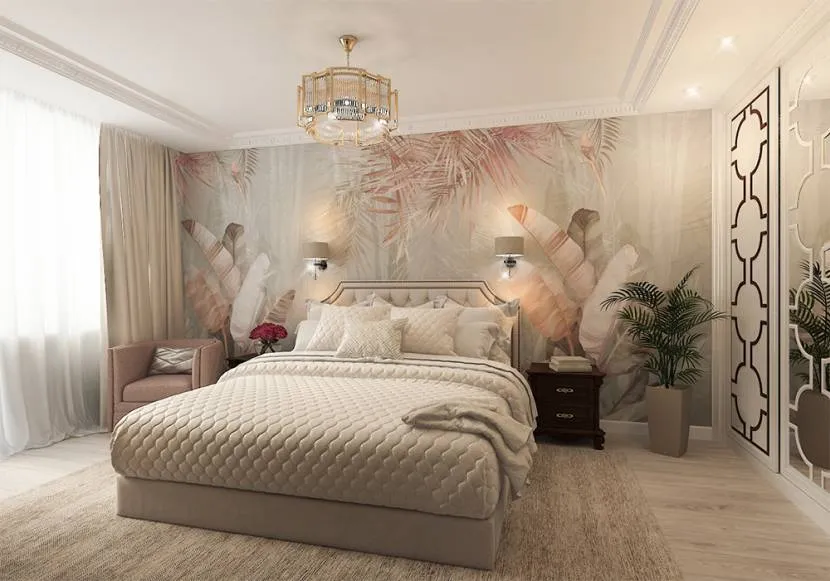 На восприятие крупного орнамента оказывает влияние площадь комнаты. Сочный и контрастный рисунок визуально делает помещение меньше, поэтому лучше всего такие полотна подходят для оформления интерьера просторной спальни (при условии акцентной стены). Малоконтрастный паттерн на нейтральном фоне лучше подходит для маленькой по площади спальной комнаты.