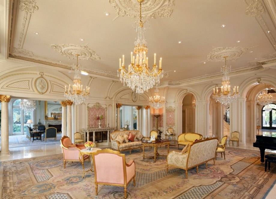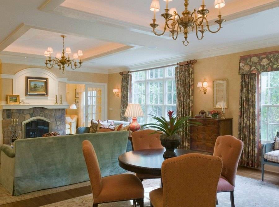 Классический интерьер. Подойдет модель лаконичной формы, но с обилием деталей (кованых элементов, подвесок). Даже сложные многоярусные конструкции выглядят изящно и легко благодаря фрагментам из хрусталя или цветного стекла.