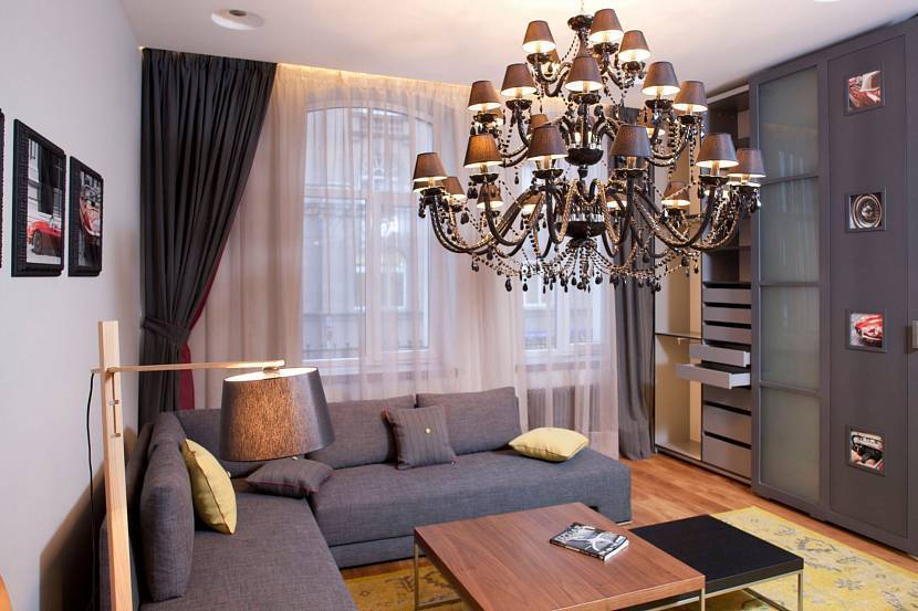 Модно в гостиной будут выглядеть и одна или несколько люстр на подвесах.