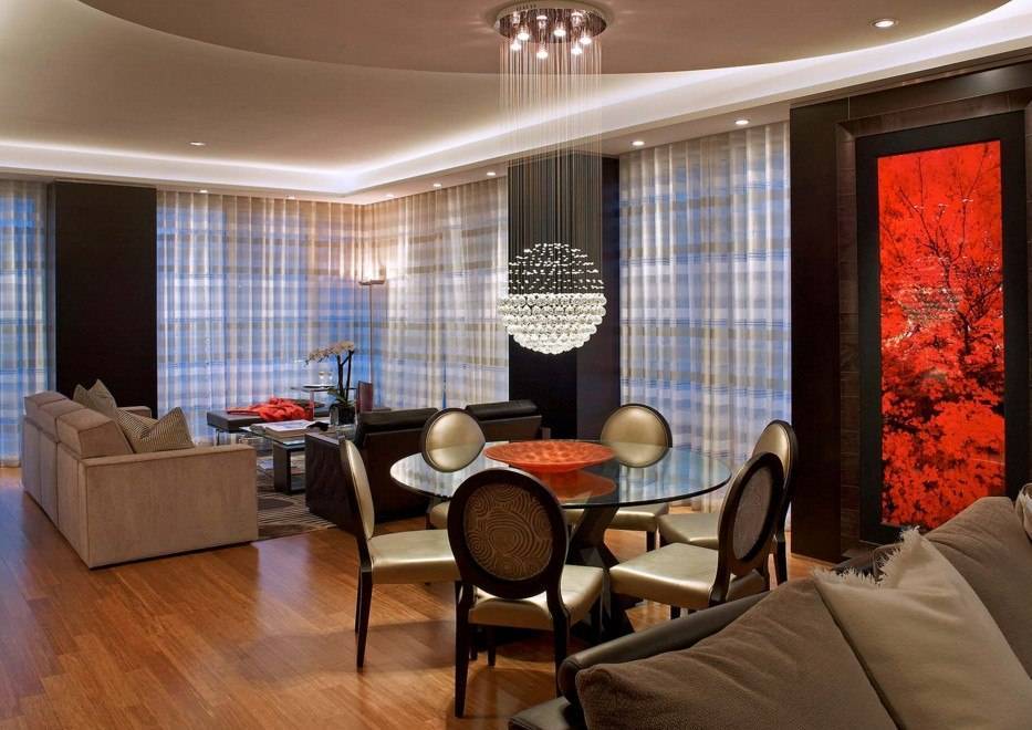 Здесь стоит обратить внимание на вариации люстр, которые очень уместно впишутся в интерьер гостевого помещения: