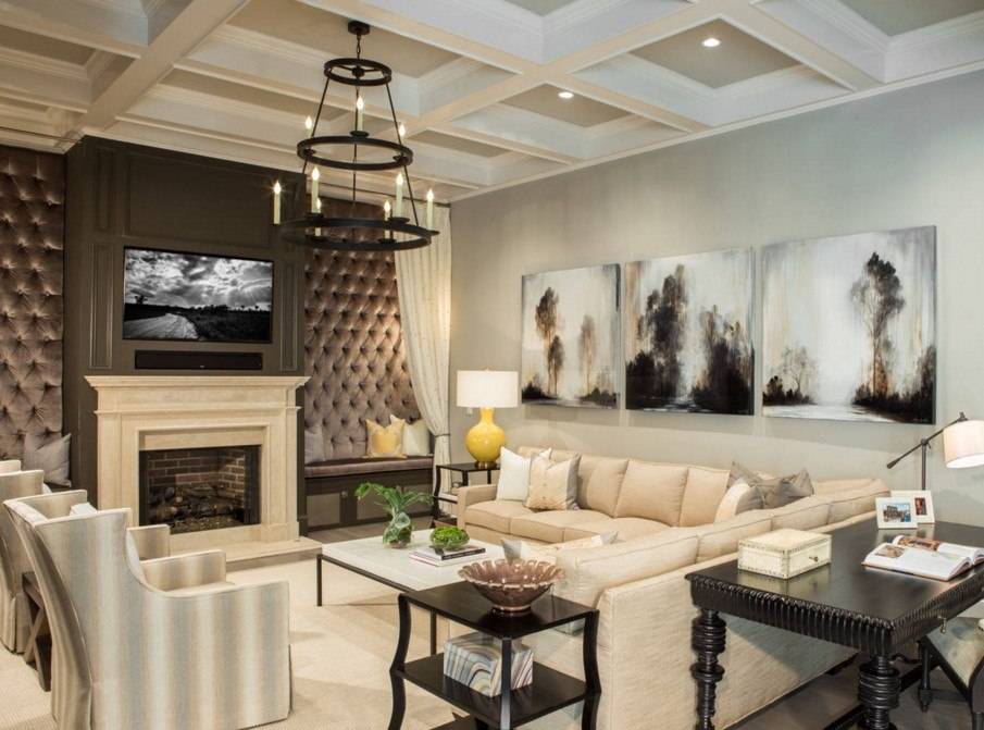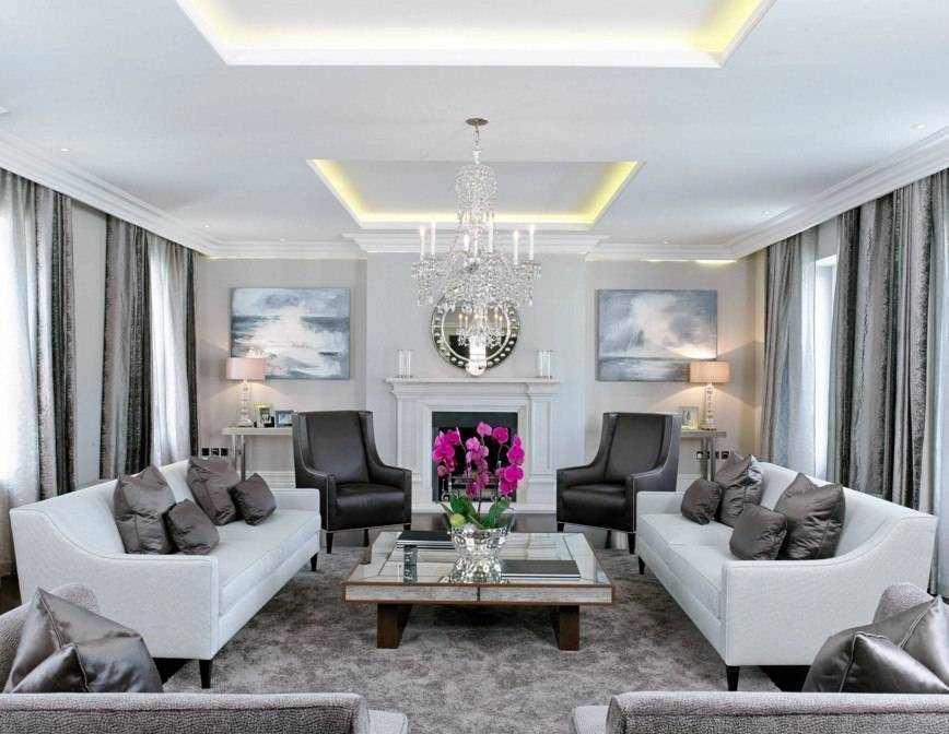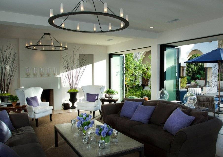 Для зонирования гостиной можно повесить две потолочные люстры и за счет этого выделить каждый функциональный участок. Установка нескольких осветительных приборов больше подходит для просторных комнат.