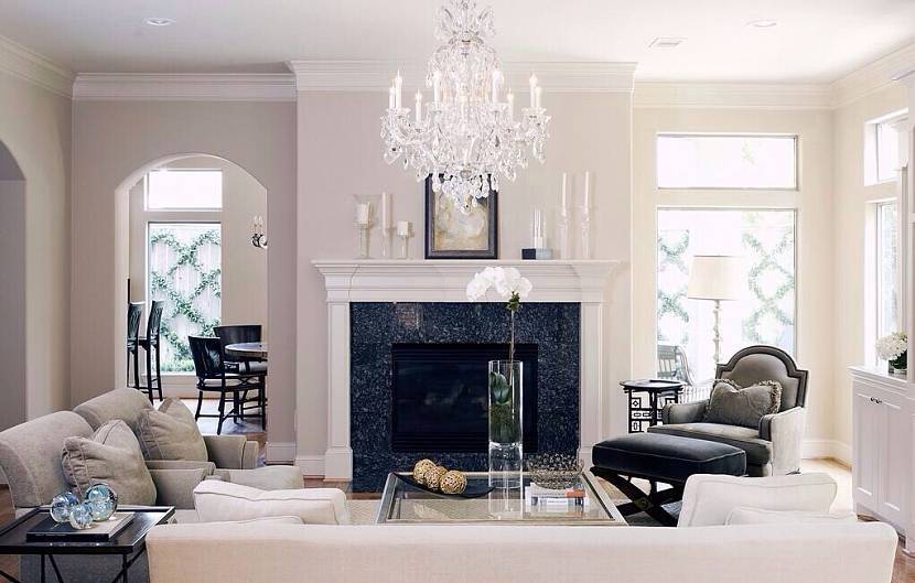 Камин в зале способен повлиять на выбор светового источника. Например, в комбинации с классическим порталом будет выгодно смотреться кованое изделие со свечами, стилизованное под канделябр.
