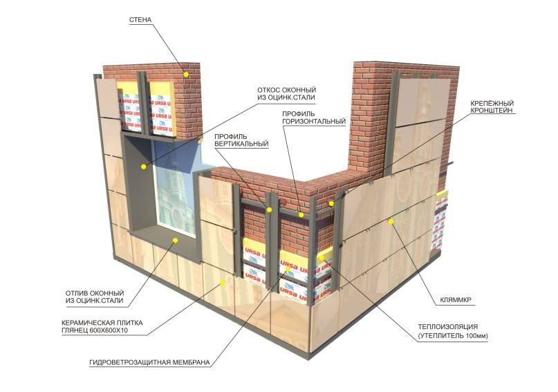 Общая схема устройства фасада из керамогранита