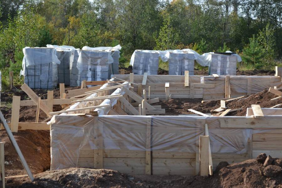 В сооружение фундамента входит: рытье котлована, засыпка песка со щебнем, для создания подушки, установка опалубок и досок, залитие самого фундамента и гидроизоляция.