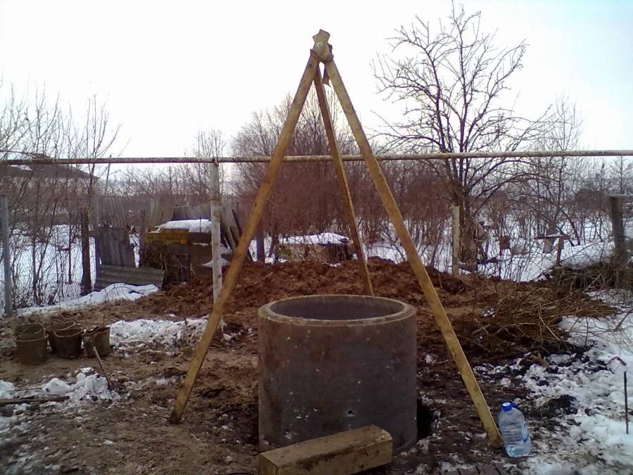 - Бетонный колодец погружается после выемки грунта на высоту кольца с помощью треноги или лебедки.