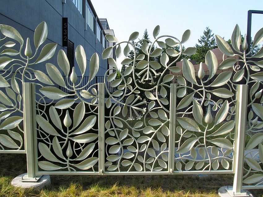 - Заборы в стиле модерн имеют мягкие природные линии, восточные орнаменты и абстрактные рисунки.