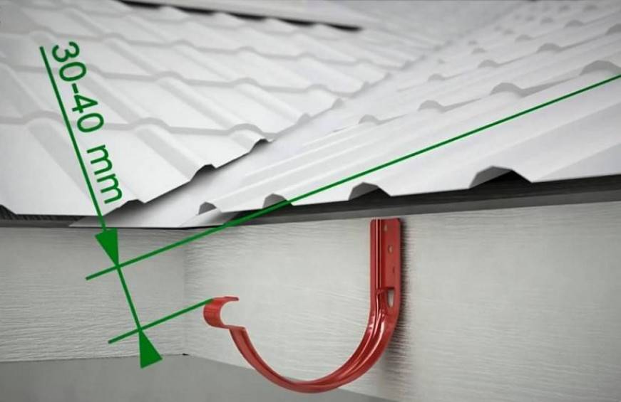 Начнем этот раздел с того, что желобчатая система водостока является самотечной. Поэтому ее монтируют под небольшим углом в пределах 3-7°. Это значит, что один конец желоба должен быть выше второго на 3-7 мм на один метр длины горизонтальной части водостока.