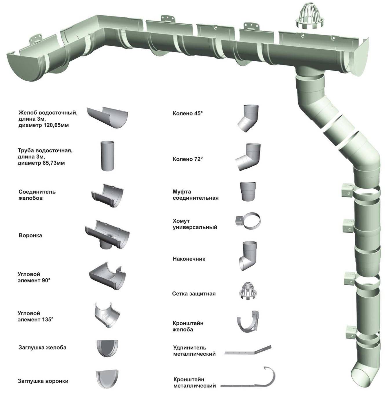 Цель конструкции – собирать воду со скатов шиферной крыши и отводить ее в дренаж. Весь процесс происходит за счет элементов, выполняющих свою роль. Обычная внешняя система водостока состоит из таких элементов: