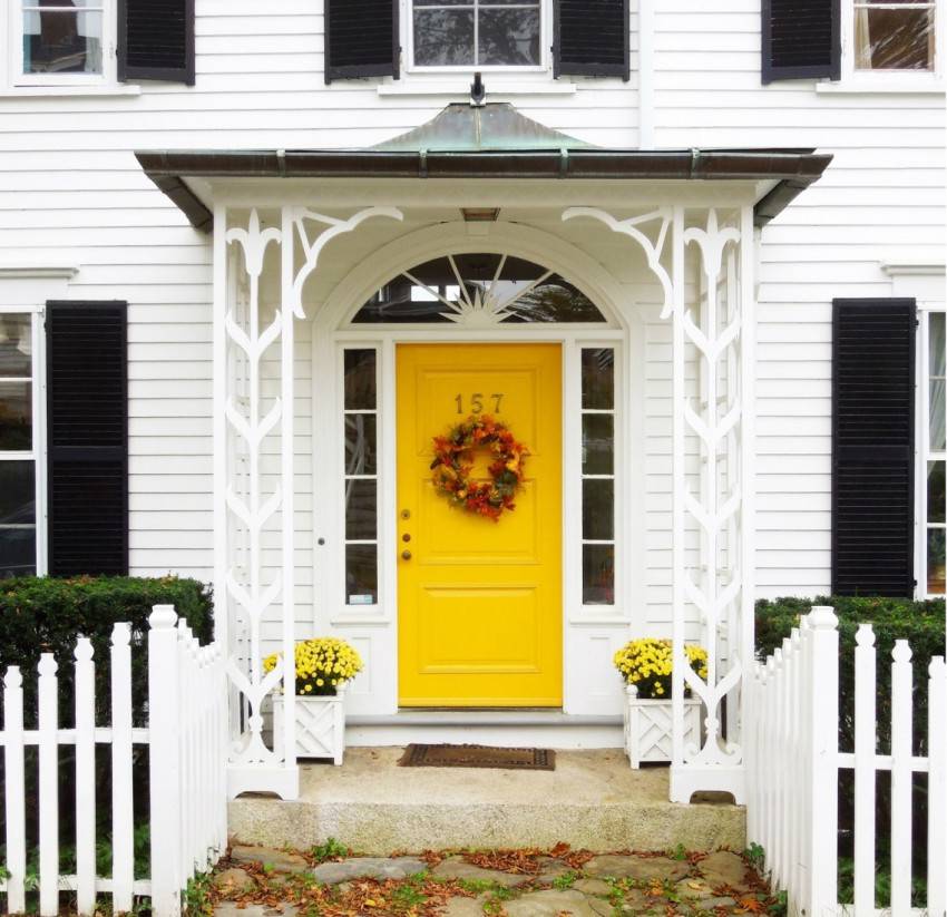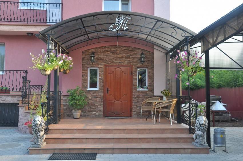 Небольшое крыльцо с навесом и перилами, украшенными ажурной ковкой, сочетаются с декором входной двери. От этого дом приобретает особый колорит и уют.