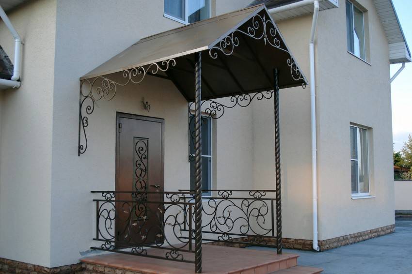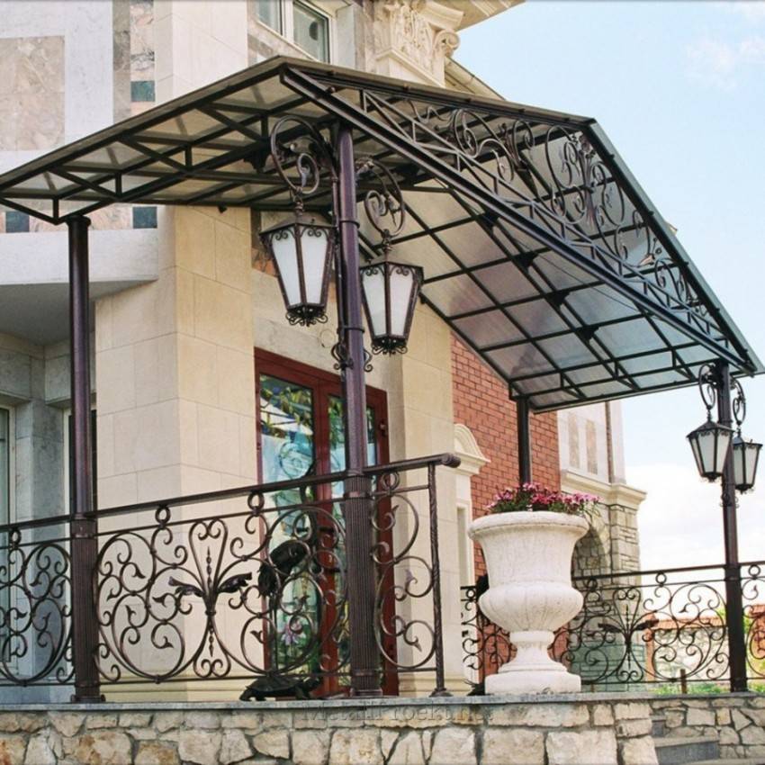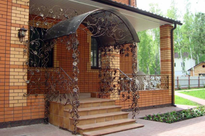 Крыльцо может быть отдельным предметом любования, если выполнить его с использованием большого количества металла, принимающего изящные формы замысловатого орнамента. Двускатный козырек и солидные фонари придают общей картине завершенность и подчеркивают богатство отделки.