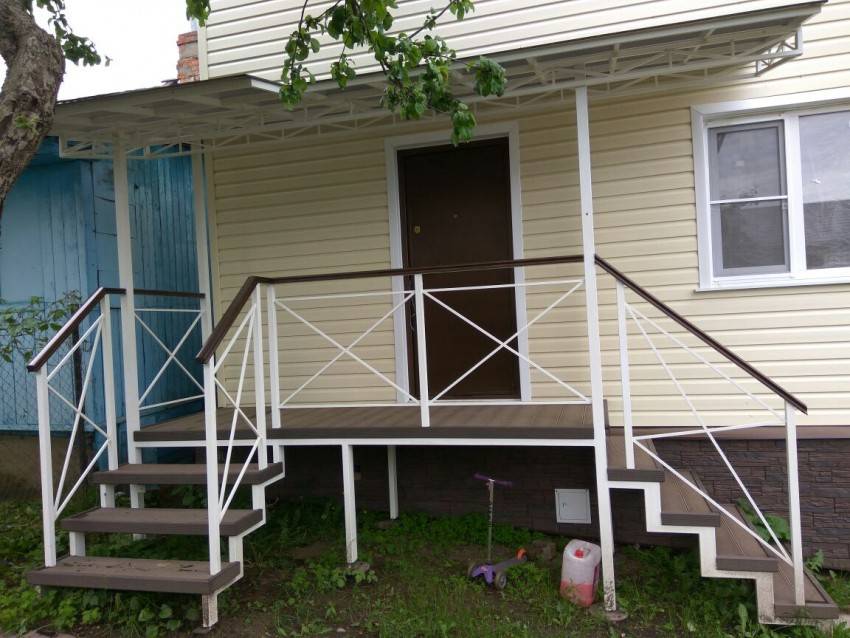 Может располагаться на отдельных вертикальных опорах или с одной стороны фиксироваться к фасадной стене. По размерам есть одна рекомендация – ширина должна позволять без проблем расходиться минимум двум людям, в большинстве случаев достаточно 1,5 метра. Кроме того, площадка должна позволять открывать дверь входящему снаружи человеку.
