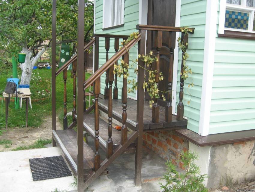 В случае если крыльцо высокое, для устойчивости, да и просто для придания ему более эстетичного внешнего вида желательно установить деревянные перила. Здесь также может быть два варианта: