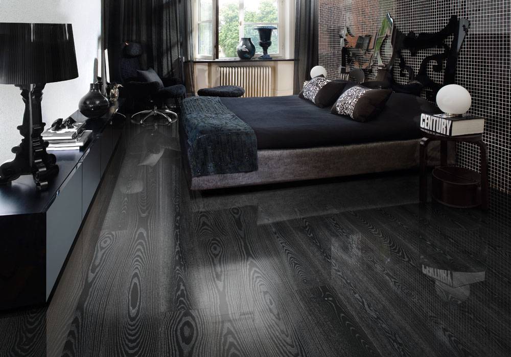При желании пол можно выкрасить в зеленый, черный или белый цвет, при этом сохранится природная красота древесины. Черный пековый лак на идеально ровной поверхности напоминает наливной пол с золотистым отливом. Изумительно смотрится и черный глянец, но уход за ним проблематичен.