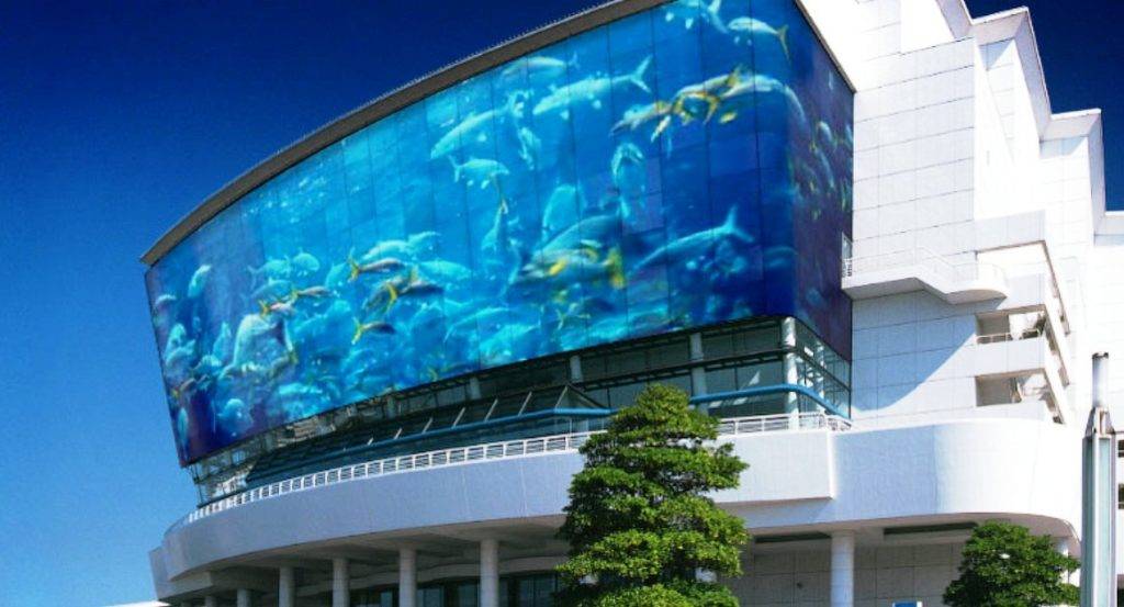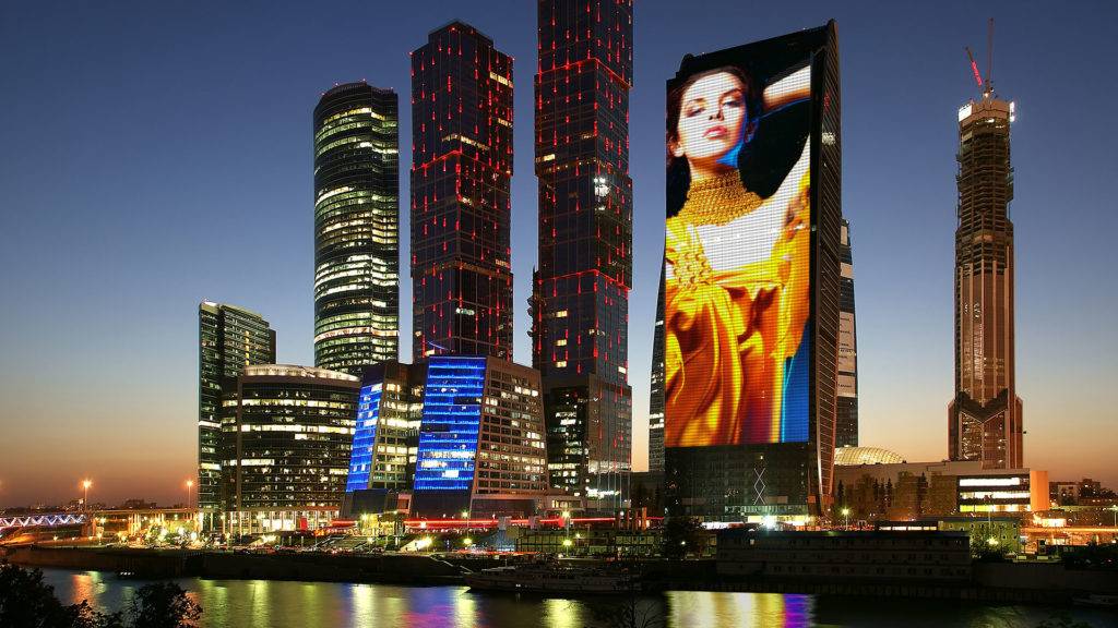 Огромные медиафасады повторяют архитектуру зданий, полностью покрывают своей поверхностью внешние стены и представляют собой светодиодную конструкцию, интегрированную в фасад строения.