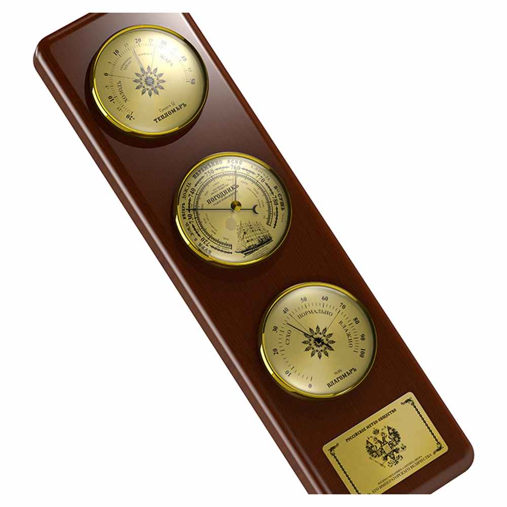 Продолжает обзор метеостанция российского производства. В отличие от предыдущей модели, изделие выпускается в черном «барокко», либо коричневом цвете. Для придания долговечности, при производстве используются только высокопрочные породы дерева. Как и у RST 05116, здесь есть три циферблата, показывающие влажность, температуру и давление.