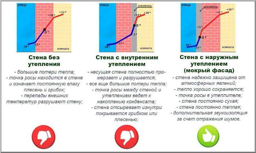 При наружном утеплении точка росы перемещается в слой теплоизоляции, соответственно конденсат полностью отсутствует