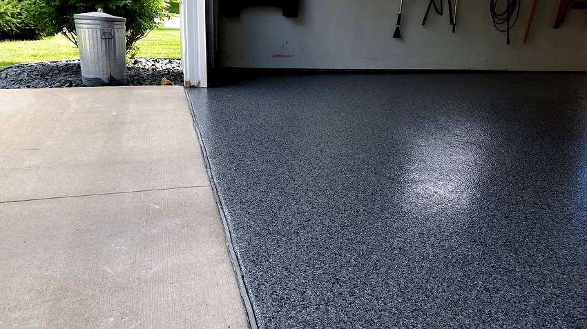 Наливной пол обходится дорого, но преимущества такого покрытия вполне оправдывают стоимость. Срок службы наливного пола не менее 40 лет, он обладает очень высокой прочностью, легко очищается, не горит, имеет идеально ровную поверхность. Для гаража лучше всего подходят эпоксидные и полиуретановые промышленные смеси. Выполнить монтаж можно самостоятельно, ведь технология заливки очень проста.