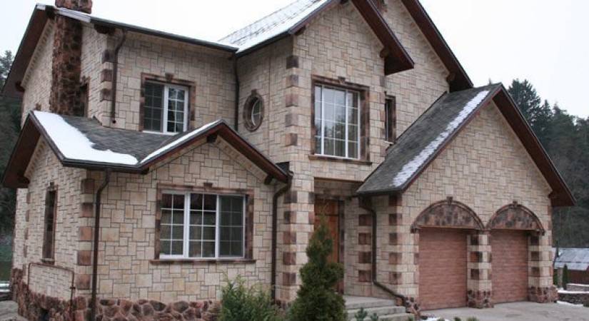 Используя этот строительный материал, удается выполнить внешнюю обшивку дома. Задействуют камень для частичной отделки СИП панелей или же для фасадных работ. По своей структуре и колористки натуральный камень отличается, но это никак не влияет на характеристики конструкции.