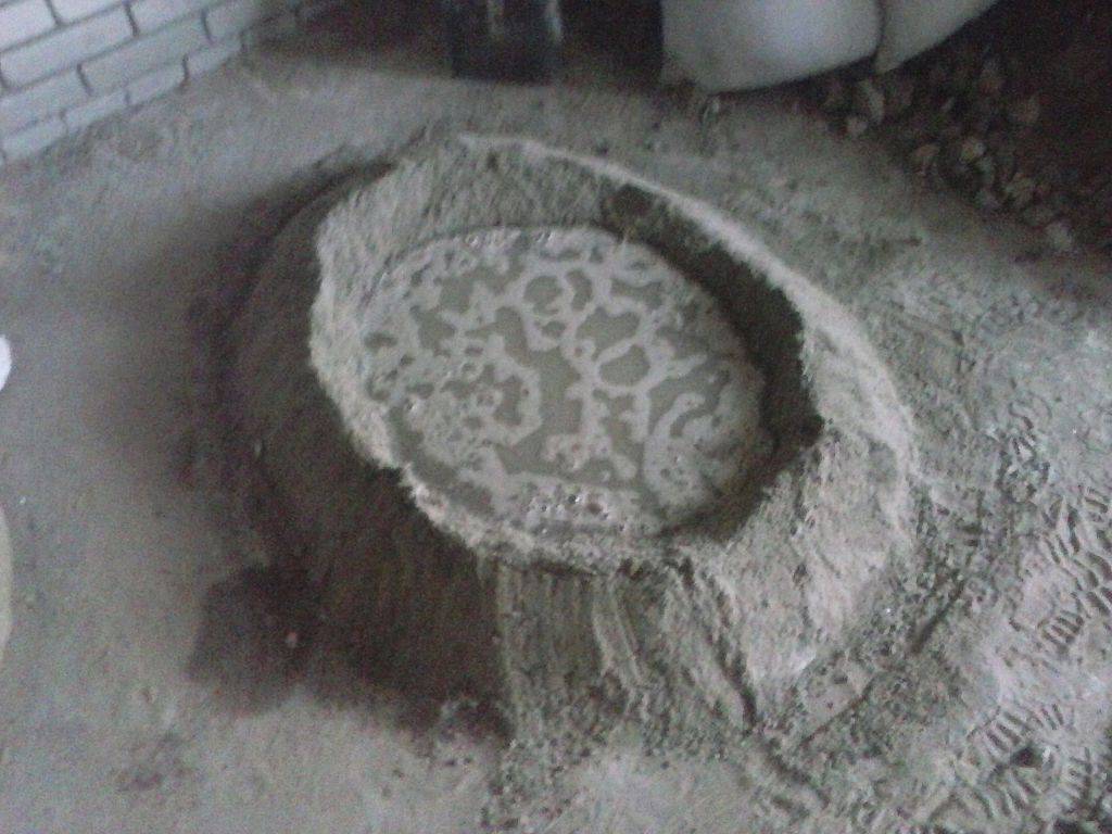 Шаг 5. Сделайте посредине кучи лунку, она должна быть довольно большой. Следите, чтобы вокруг всегда был вал сухого раствора, он не допускайте вытекания воды во время замеса.