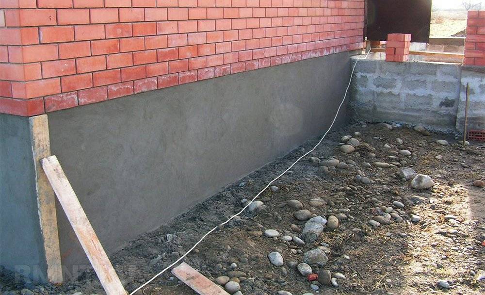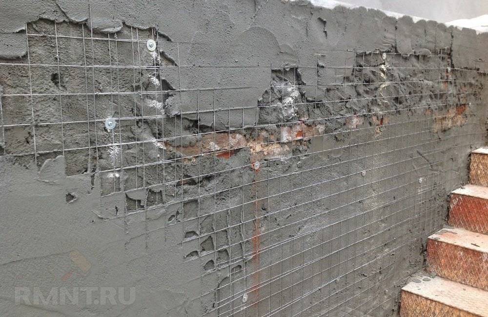 Итак, армирование наружной плоскости может выполняться стальной арматурной сеткой с ячейкой порядка 150–200 мм, которая закладывается в слой бетона с соблюдением защитного слоя не менее 20 мм. Если армирование плоскости фундамета не проводилось, сетку устанавливают в наружном штукатурном слое. При этом обязательно выполнить предварительный набрызг слоем около 10–15 мм, а затем закрепить сетку. Размер ячейки в таком случае лучше выбрать поменьше — около 120–150 мм.