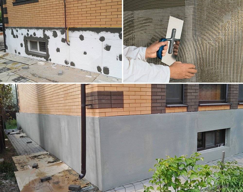 Подготовка утеплённого цоколя выполняется с помощью стеклотканевой фасадной сетки. Её укладывают в два слоя: первый сразу после предварительного набрызга толщиной от 20 мм, второй — ещё через 20 мм. После укладки второго слоя армирования производится крепление штукатурной «корки» сквозь утеплитель с помощью тарельчатых дюбелей с распорным элементом. Завершающая подготовка — наброс ещё 25–30 мм штукатурки, таким образом, итоговая толщина штукатурки увеличивается до 70 мм.