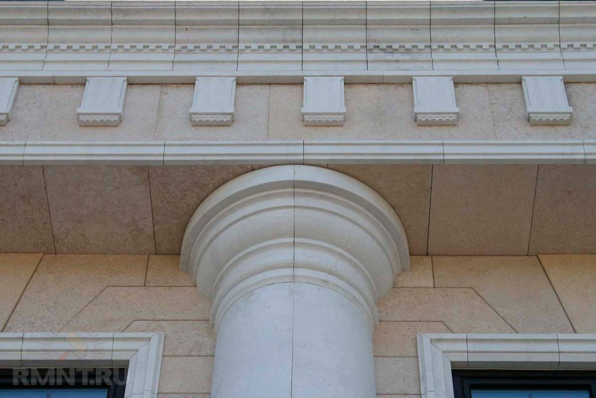 Для обустройства ограждения террас можно приобрести балясины и перильные камни. Колонны и колоновидные пилястры устраиваются из полуколец, внутренние полости которых заполняются лёгким бетоном. Стыки между штучными изделиями после завершения работ обычно шлифуют: в отличии от рядовой облицовки рельефные элементы практически не имеют визуальных стыков.