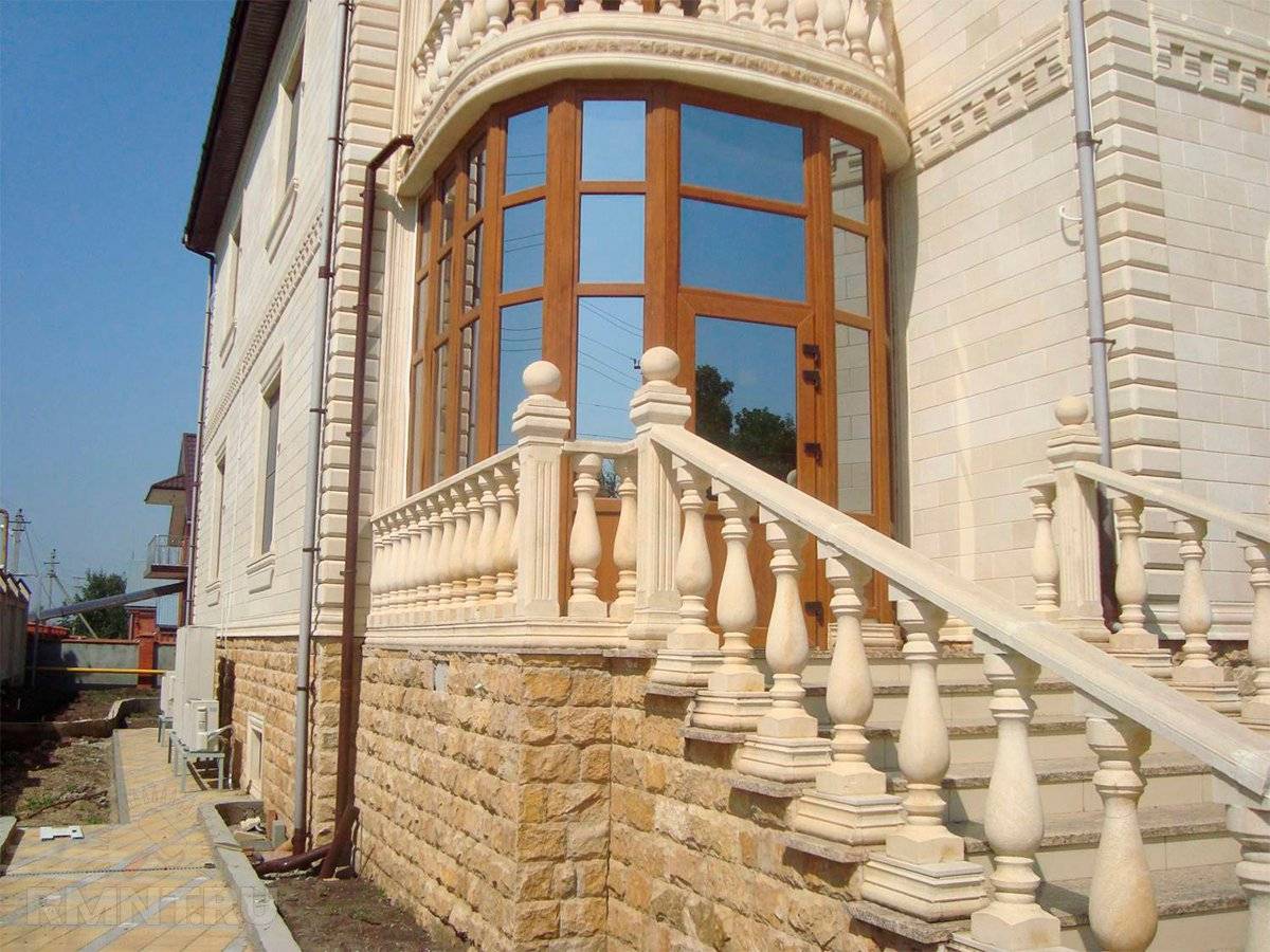 Дагестанский камень отлично подходит и для более вычурного оформления фасада: из него достаточно легко изготовить венцы и карнизные планки, фигурные элементы рустов, балюстрады, колонны, пилястры и откосы. Практически все эти изделия имеются в ассортименте поставщиков дагестанского камня, элементы особо сложной формы могут быть изготовлены на заказ.