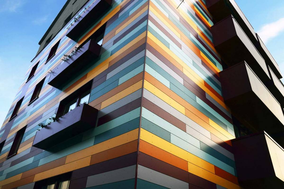 Эффектный металлический блеск позволяет имитировать литые пластины с различными декоративными элементами от с клепок до эффекта патинирования, ржавчины, разнообразие оттенков дает возможность изобразить любой металл от чугуна до меди или нержавейки. Актуально для зданий в стиле техно.