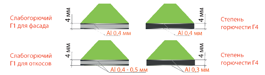 Алюмкомпозит в разрезе представляет сэндвич. Берутся два листа сплава алюминия от 0,2 до 0,5 см толщины. Между ними размещается прослойка. Она состоит из соединения гидроксида алюминия со смолой или из полиэтилена. Для наполнения композитных панелей используется полиэтилен низкого давления. Смесь смолы с гидроксидом алюминия обладает высокой огнестойкостью. Этого нельзя сказать о полиэтилене.