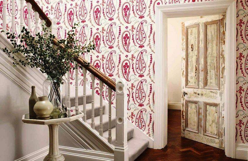Необычные принты и цветовые комбинации обоев формируют эффектное сочетание. Если нужно придать интерьеру прихожей индивидуальность, используйте дамасский узор, арабеску, обратитесь к этнической тематике. Пример оформления стен обоями с рисунком «турецкого огурца» — на фото ниже: