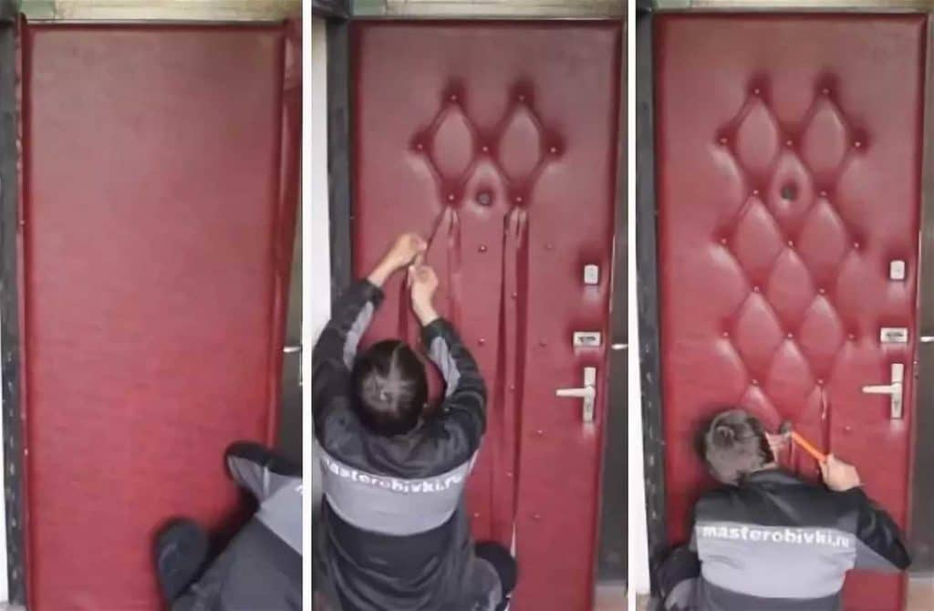 Обивают входные двери в основном для улучшения звукоизоляции и теплоизоляции. Ну и параллельно этому, конечно, не забываем эстетику, потому что дверь, обитая дермантином с рисунком из декоративных гвоздей или мебельных пуговиц, имеет очень привлекательный вид. И в этой статье речь пойдет о том, как обшить дверь дермантином своими руками.