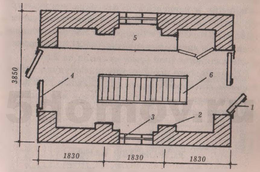 Рис. 2. Гараж с воротами, калиткой и смотровой ямой. План на отметке — 1,5 м (вариант расположения в цокольной части дома; 1 — калитка; 2 — столб кирпичный  (для увеличения устойчивости), 3 — окно из стеклоблоков; 4 — ворота; 5 —верстак; 6 — смотровая яма