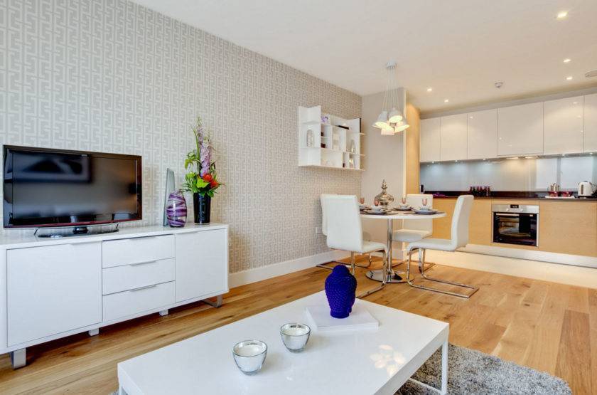 Для того, чтобы не только визуально, но и на практике расширить маленькую комнату, применяется объединение гостиной с соседними помещениями – кухней или спальней.